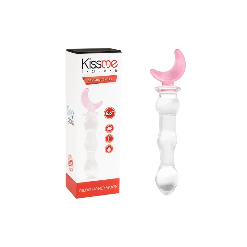 Dildo de vidrio. Cuenta con nódulos que aportan una estimulación más placentera, su agarra es en forma de luna.